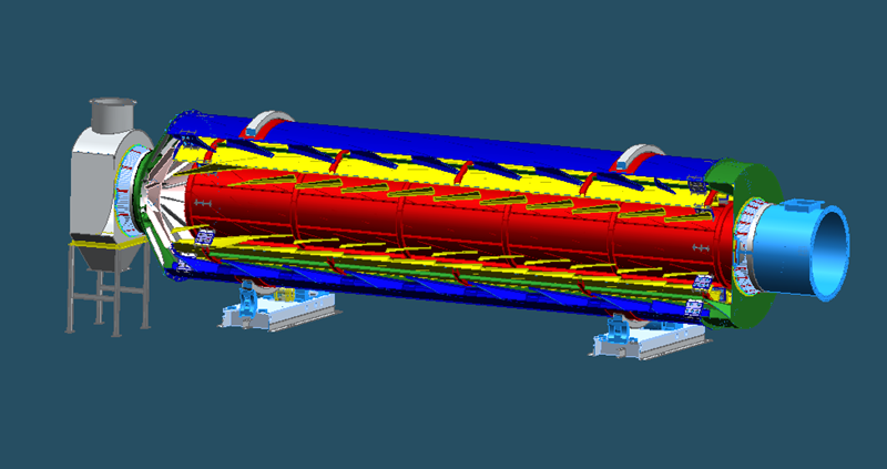 三筒烘干機(jī)內(nèi)裝有用于攪拌揚(yáng)料的揚(yáng)料板和導(dǎo)料板,這種結(jié)果能夠保證被烘干的材料能夠在重力作用下沿著筒內(nèi)揚(yáng)料板和導(dǎo)料板的方向運(yùn)動(dòng),來(lái)回三層有效的提高了烘干材料在筒內(nèi)的停留時(shí)間,